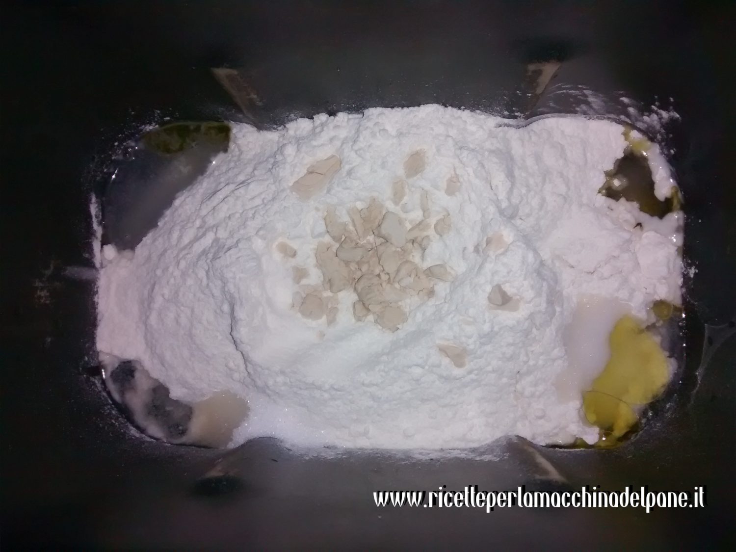 Inserite nella macchina prima gli ingredienti liquidi, ovvero l’acqua e l’olio, poi aggiungete la farina. Fate un piccolo pozzo al centro in cui dovete inserire il lievito; ai bordi, invece, aggiungete da una parte il sale e dall’altra lo zucchero: