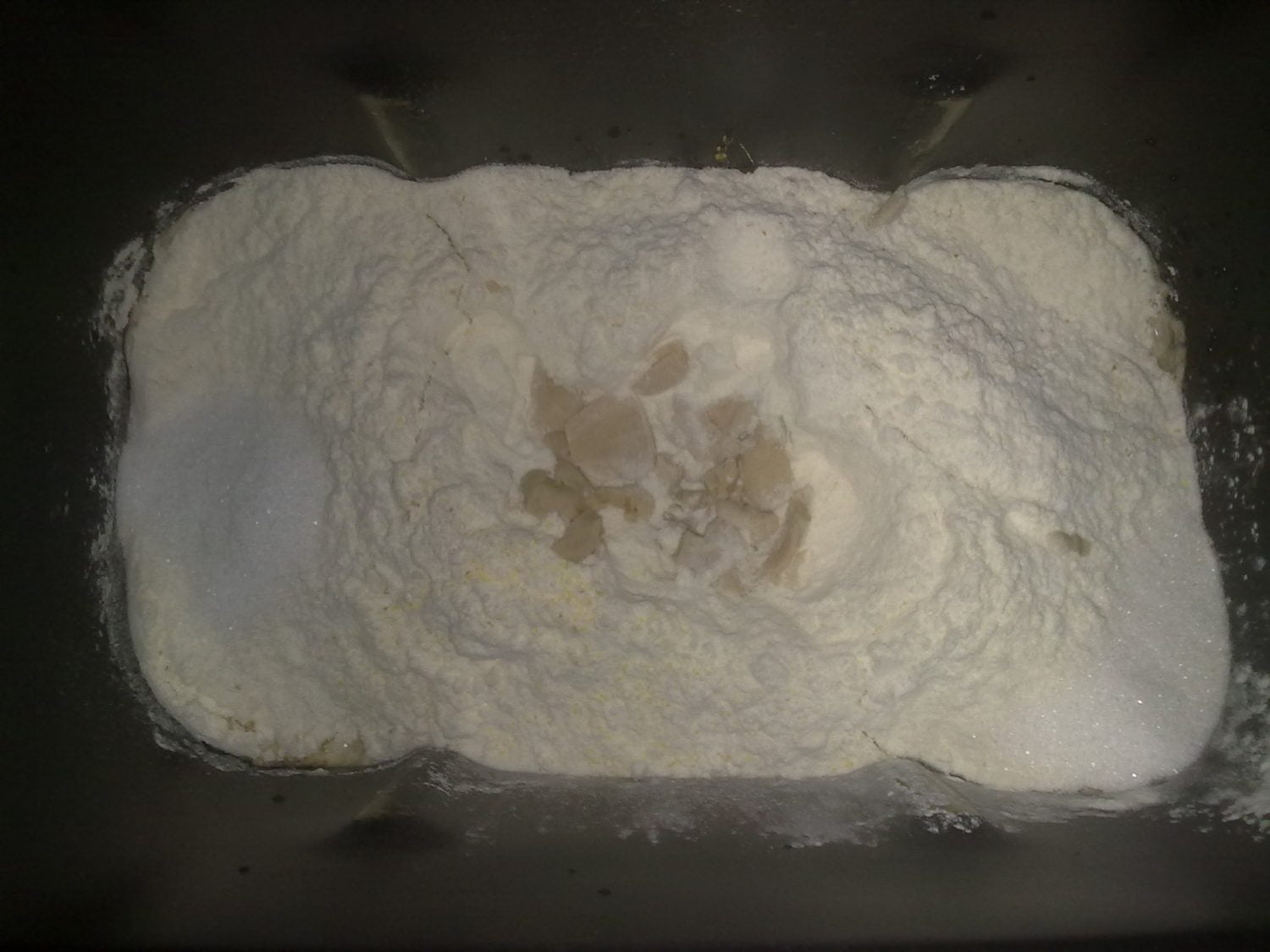 Poi aggiungiamo le farine, aggiungendo il lievito al centro, il sale da una parte e lo zucchero dall’altra: