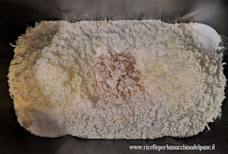 Inserite le farine, fate un piccolo pozzetto al centro e aggiungetevi il lievito fresco frantumato. Ai lati opposti del cestello aggiungete sale e zucchero e infine inserite anche la noce moscata e il formaggio grattugiato