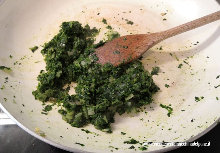 Quando lo scalogno sarà ben dorato, aggiungete gli spinaci ancora surgelati e cuoceteli secondo le indicazioni della confezione (di solito per circa 5 minuti). Salate a piacere e lasciate raffreddare il tutto per circa 15 minuti.
