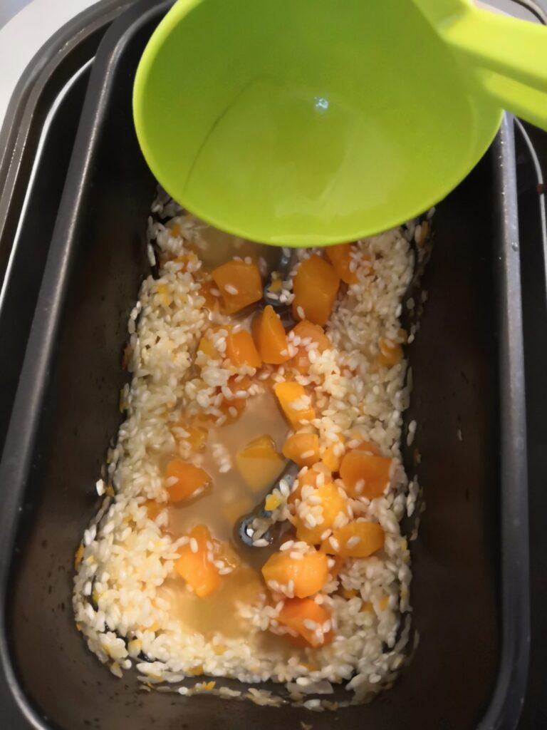 Le palette inizieranno a girare e a mescolare gli ingredienti. Dopo 5 minuti, aggiungete il riso. Fermate il programma usando il tasto pausa ogni volta che aggiungete gli ingredienti, altrimenti dei pezzi di zucca possono schizzare fuori dal cestello! Dopo aver aggiunto gli ingredienti, fate ripartire il programma
