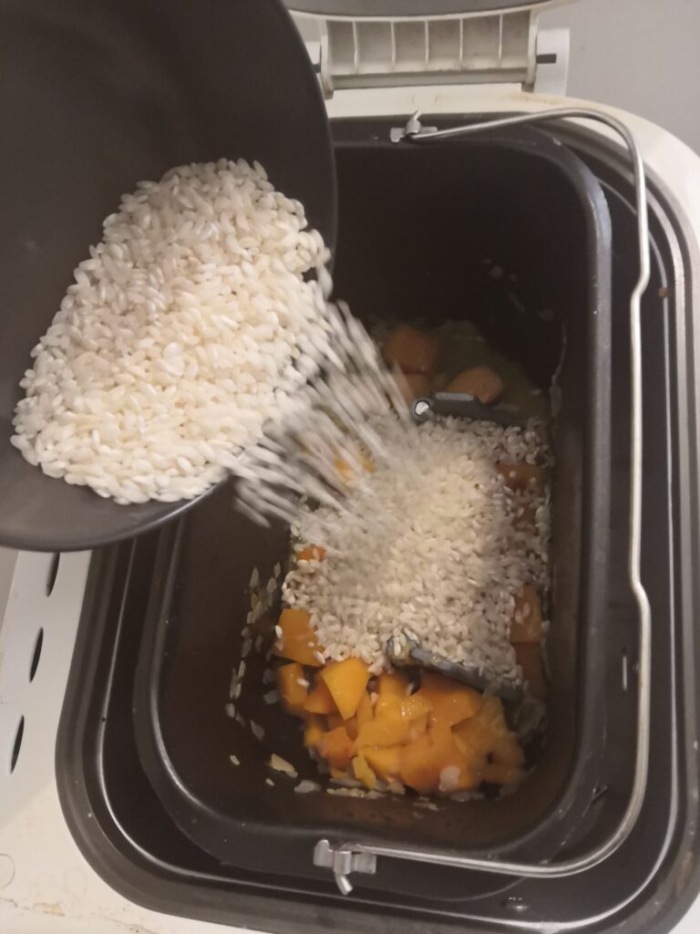 Ricetta per preparare un buonissimo e saporito risotto alla zucca con la macchina del pane, con pochissima fatica rispetto alla normale cottura in padella!