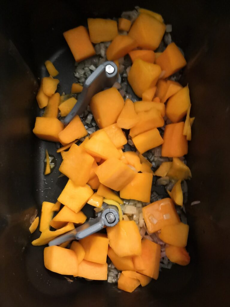 Dopo 10 minuti, o comunque quando noterete che lo scalogno inizierà a imbiondirsi, aggiungete anche la zucca tagliata a cubetti. In questa fase la macchina del pane scalderà soltanto senza mescolare, ma è normale, non preoccupatevi