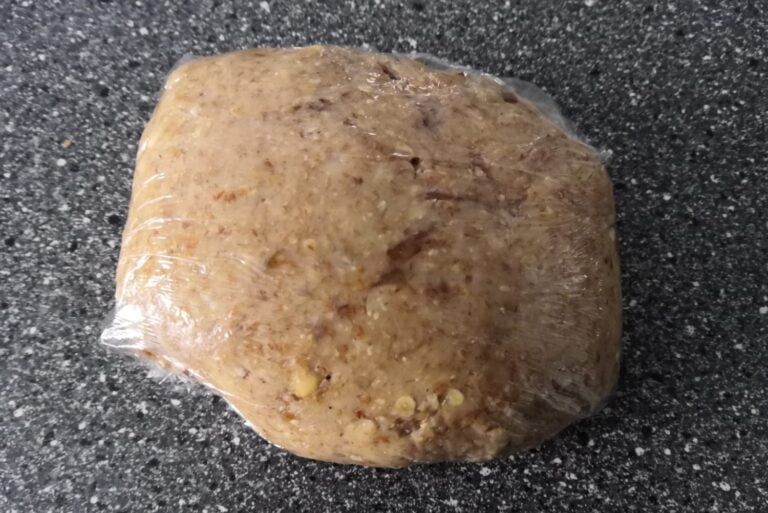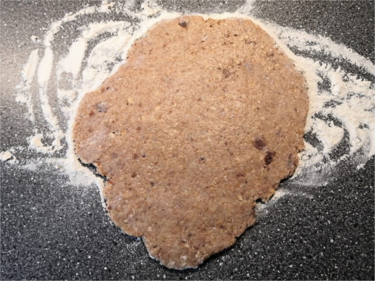 Stendete della pellicola sul tavolo della vostra cucina e versatevi tutto il contenuto del cestello della macchina del pane. Chiudete l'impasto con la pellicola e fatelo riposare nel frigo per 30 minuti. Nel frattempo, preriscaldate il forno a 180°C