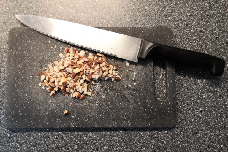 Tritate le mandorle a pezzettini usando un coltello lungo e un tagliere. Potete anche usare mandorle già tritate e passare al prossimo passo