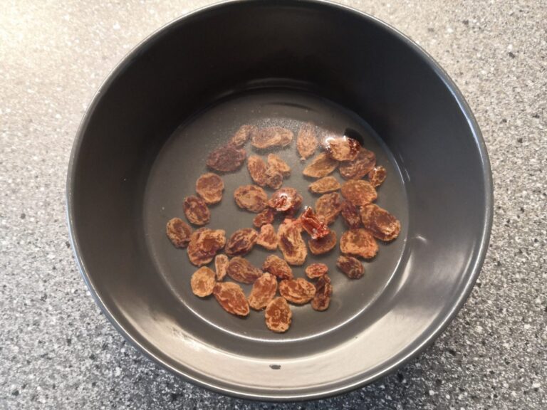 Mettete l'uvetta in ammollo per 5 minuti in 60ml d'acqua tiepida (più o meno a 35°C)