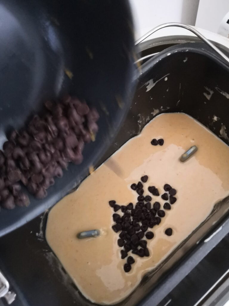 Quando la macchina emetterà dei "bip" ripetuti, aggiungete le gocce di cioccolato. Se la vostra macchina del pane non emette suoni, aggiungetele 5 minuti prima della fine della fase di impasto