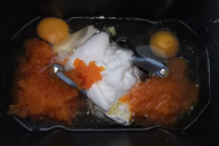 Aggiungete nel cestello della macchina del pane tutti gli ingredienti liquidi, quindi yogurt, uova e la zucca cotta