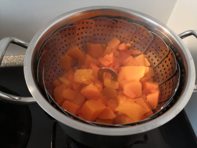 Tagliate la zucca a cubetti e cuocetela al vapore oppure bollitela, per 15 minuti. L'importante è che si ammorbidisca. Una volta cotta, fatela raffreddare e poi schiacciatela con una forchetta