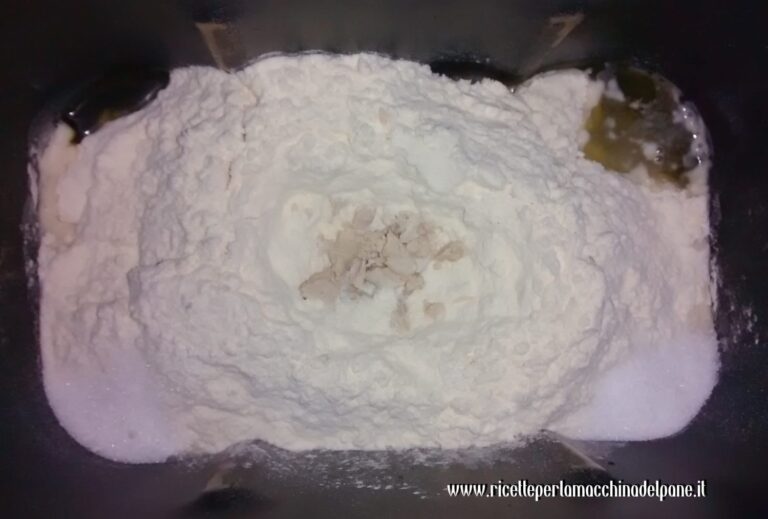 Inserite nella macchina prima i liquidi, poi la farina. Fate un piccolo pozzo al centro in cui va aggiunto il lievito, poi inserite il sale da una parte e lo zucchero dall'altra